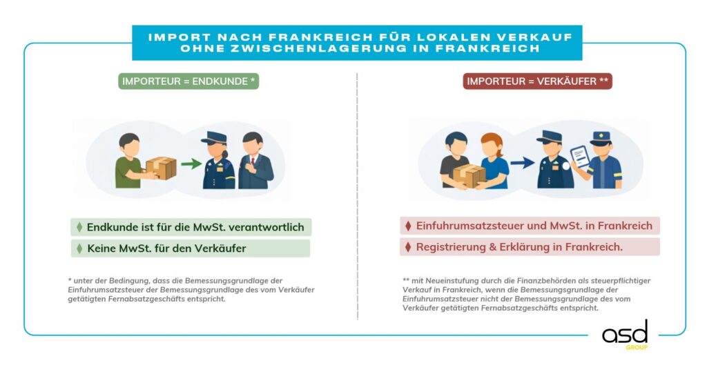 Unter diesen Umständen ist der Verkäufer nicht zur Entrichtung der Einfuhrumsatzsteuer in Frankreich verpflichtet. Darüber hinaus gilt der Verkauf an den Endkunden als außerhalb des territorialen Anwendungsbereichs der Umsatzsteuer liegend; daher ist er für diesen Verkauf in Frankreich nicht umsatzsteuerpflichtig.
