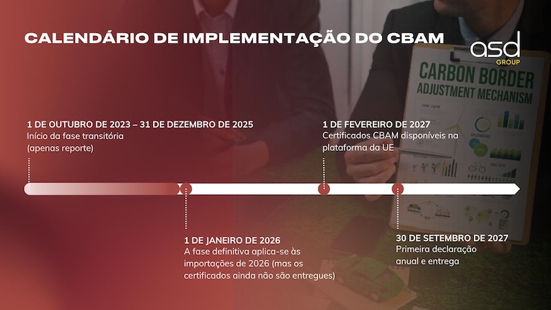 A compra de certificados CBAM será obrigatória a partir da fase definitiva (2026), em função das emissões incorporadas nos produtos importados.